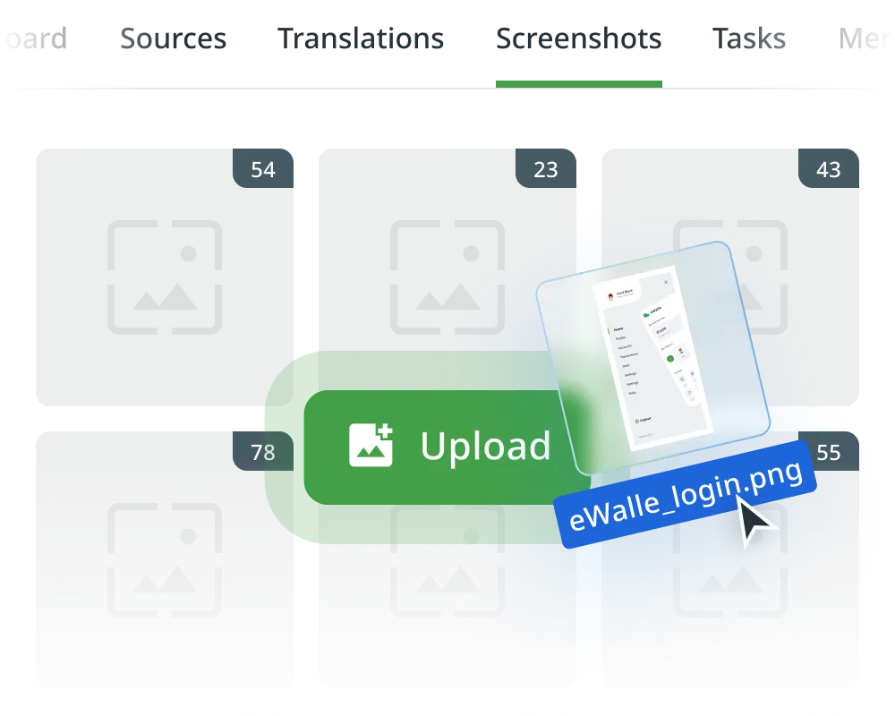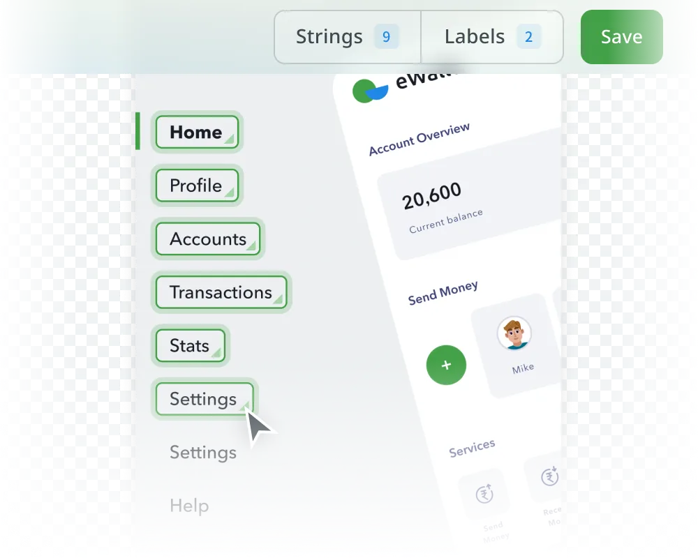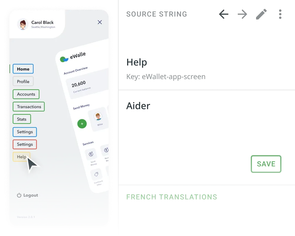 Crowdin’in Ekran Çevirisi, kullanıcıların arayüz öğelerini uygulama tasarımınızın gerçek zamanlı önizlemesiyle çevirmesini sağlayarak kullanıcı arayüzü yerelleştirmesini basitleştirir.